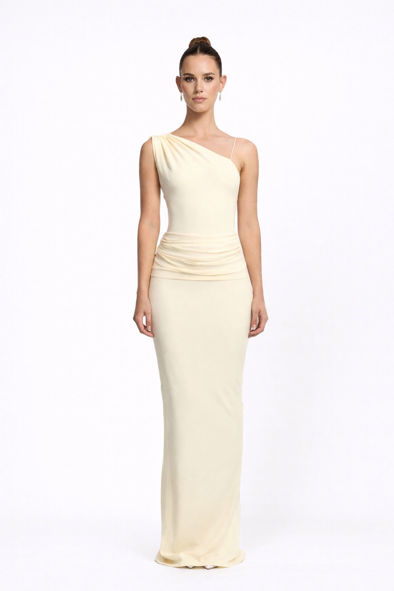 Meet the Greer Gown - a modern, floor-length silhouette made to stand out. Crafted from signature stretch crepe, this one-shoulder design features an asymmetrical neckline, an open back, and delicate ruching that softly sculpts the body. Effortlessly elegant and endlessly flattering, Greer is perfect for everything from intimate evenings to unforgettable events.