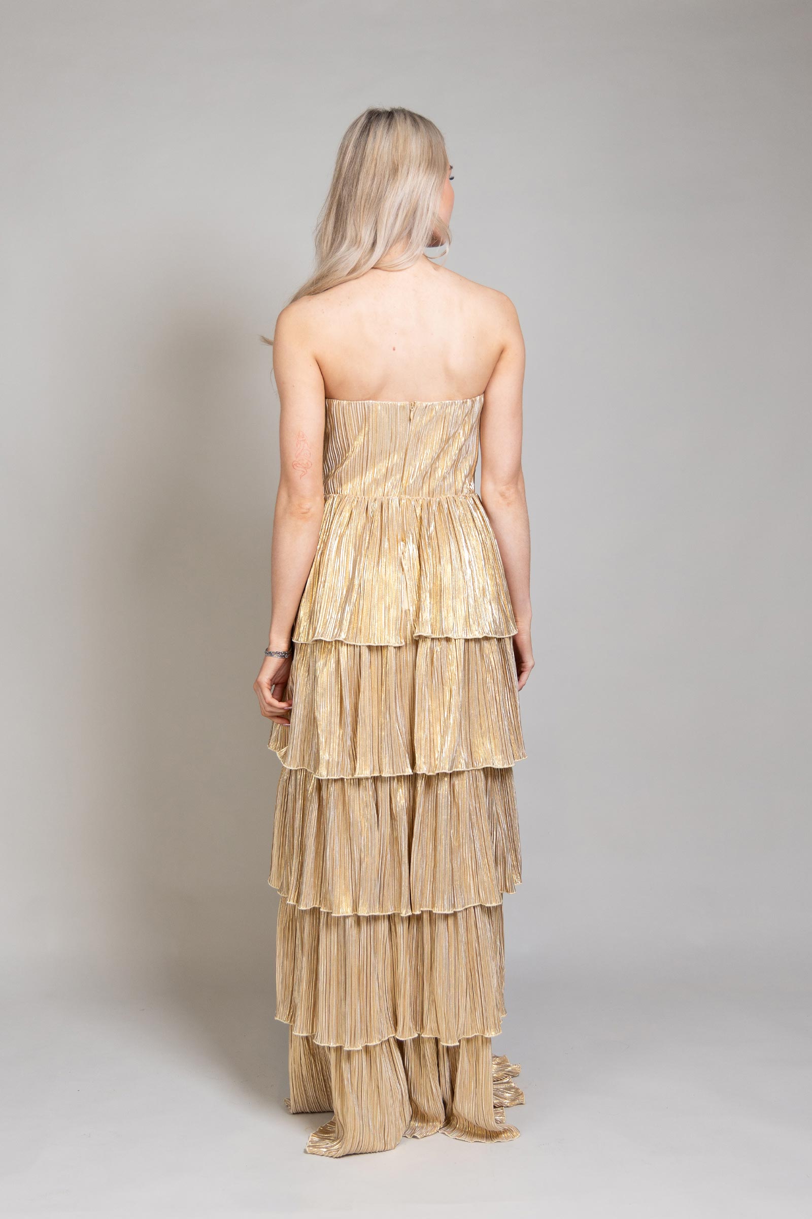 This strapless gold dress is designed to make a statement. Featuring soft frill detailing throughout, it brings texture and movement to a sleek, flattering silhouette.
