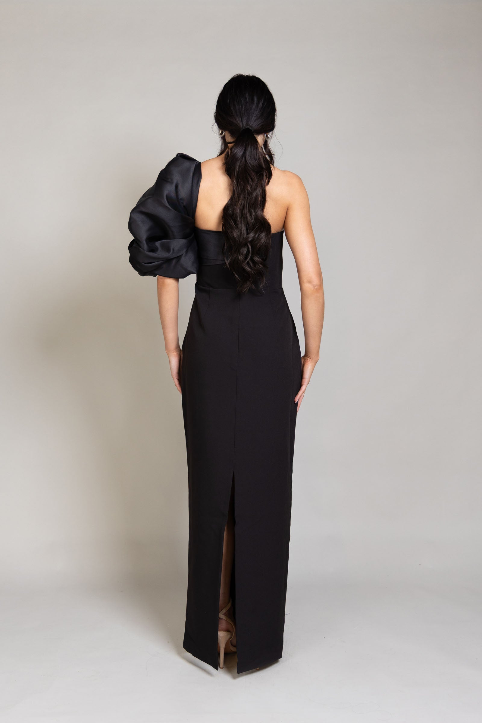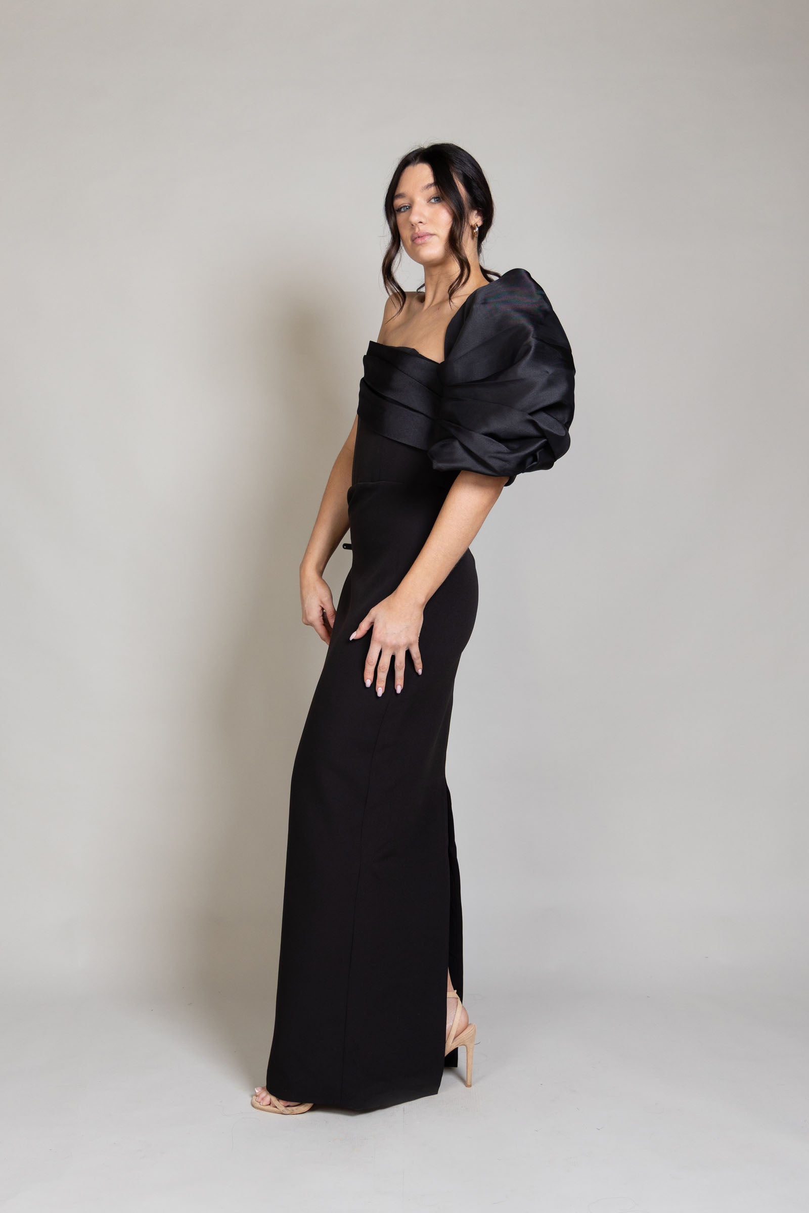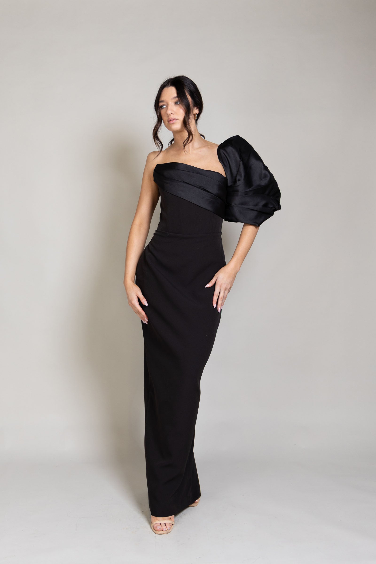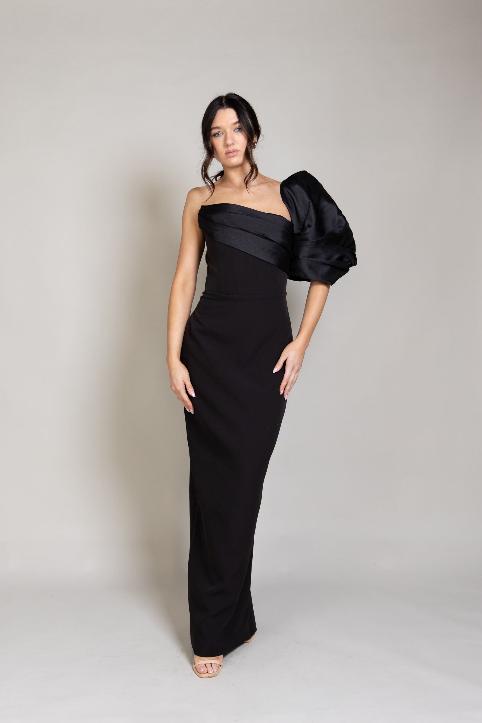 The Heinrich Gown is a striking midi dress with an asymmetric neckline and a contrasting black satin folded sash that extends into a dramatic off-the-shoulder sleeve. Finished with a back split and an invisible centre-back zipper, it offers a refined, statement-making look, available to rent for your next special occasion.