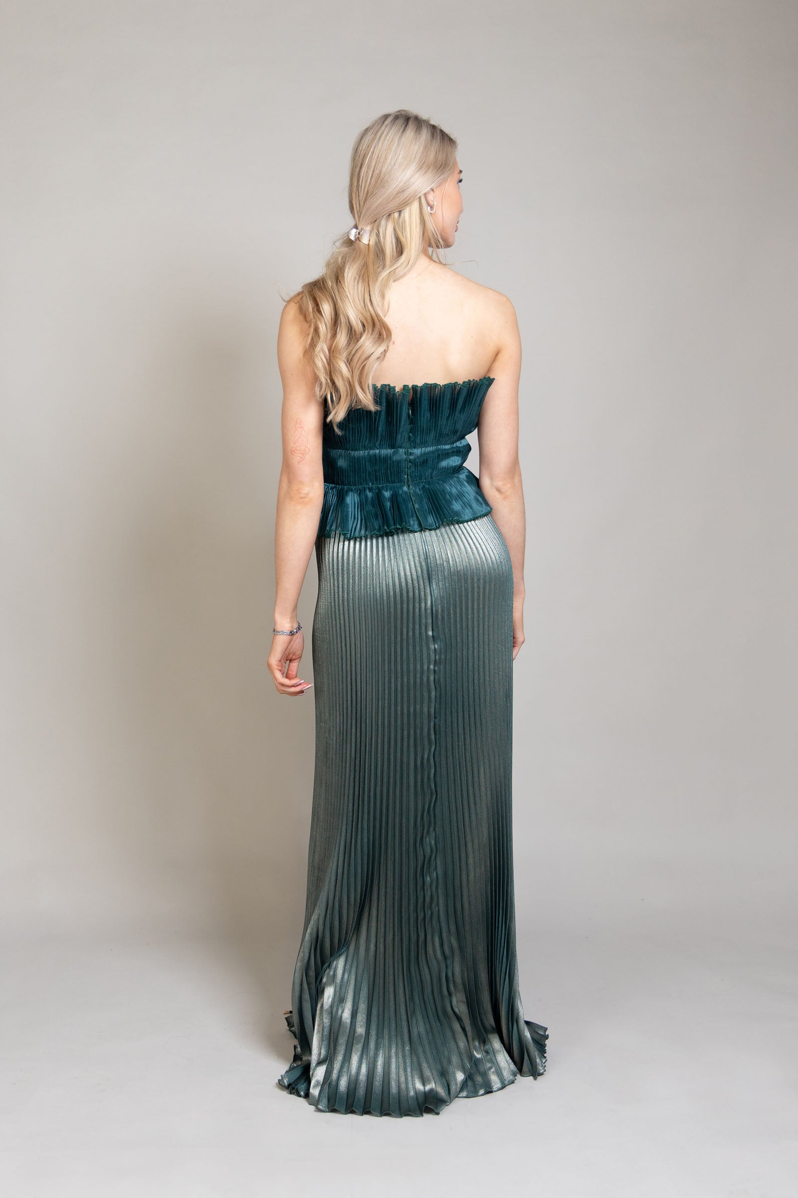 Exquisitely crafted with intricate pleating and a structured corseted bodice, the Masquerade Gown is designed to flatter the figure, beautifully framing the décolletage before flowing into a dramatic, full-length silhouette.
