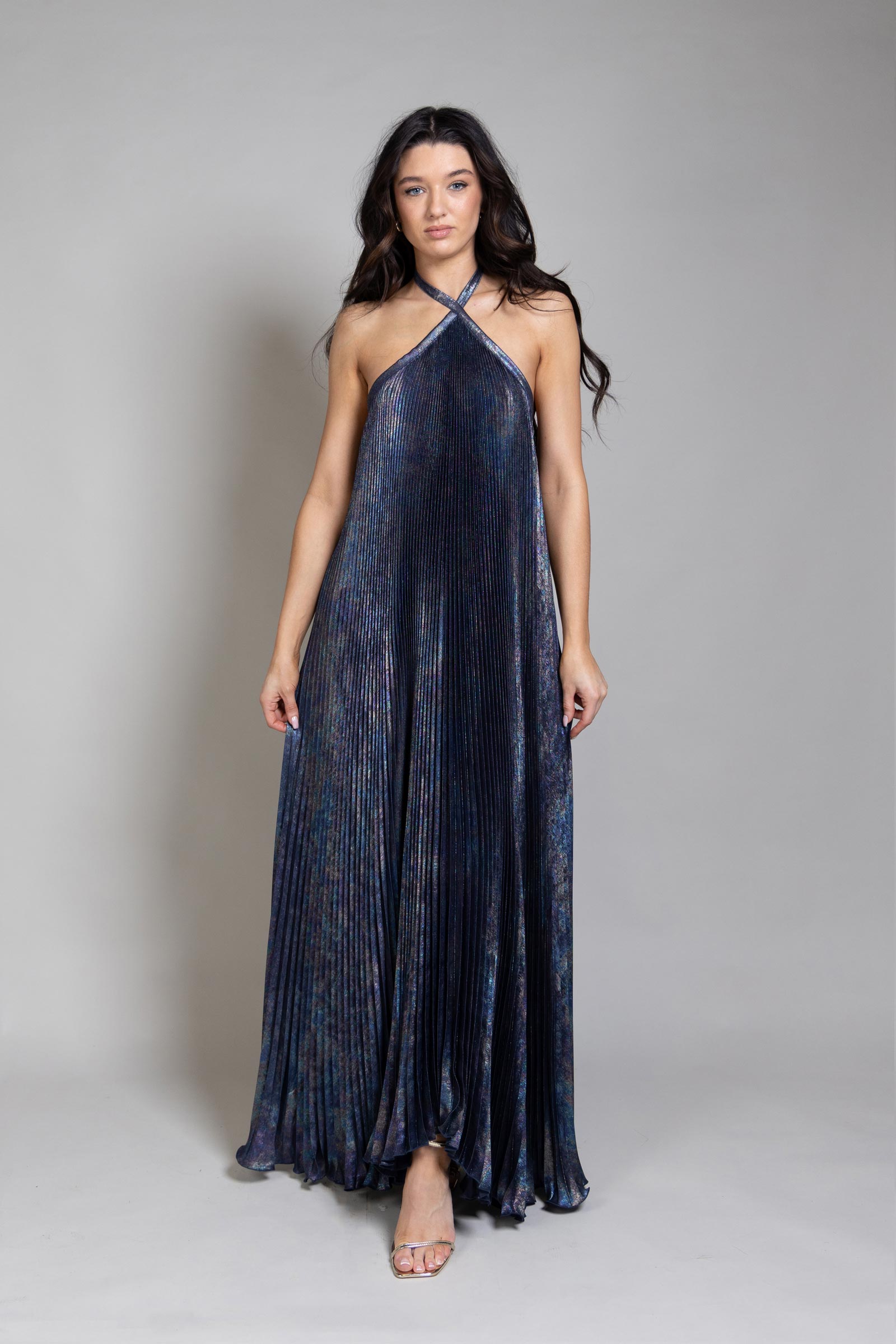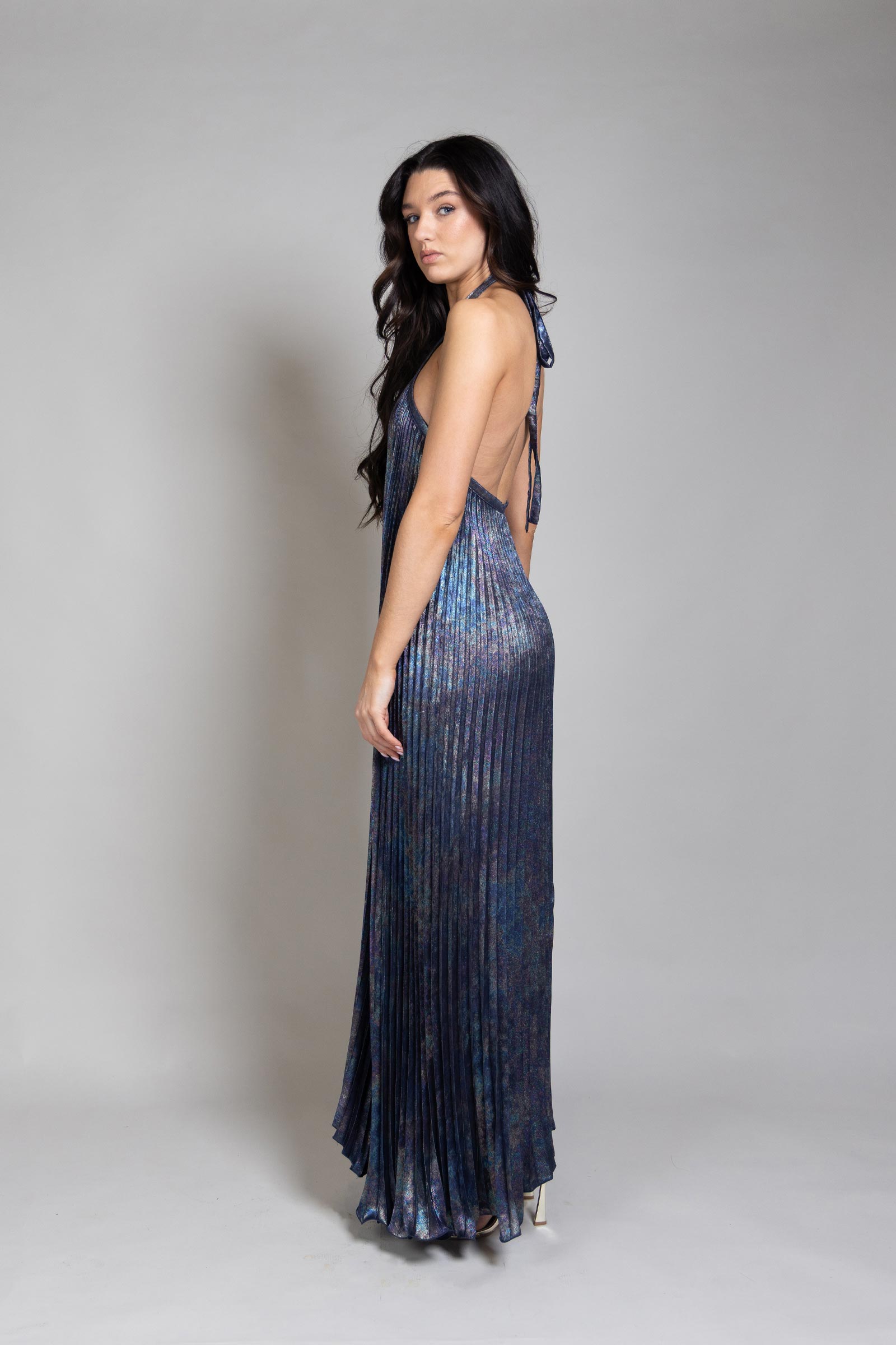This Deesse Gown - Crafted with elegance and grandiosity in mind. The theatrical pleats are elevated by the length of the gown, creating an exquisite silhouette that will move with finesse. Featuring a delicate halter neckline, contemporary inverted hemline, and finished with open back. A striking gown with an unwavering air of opulence.
