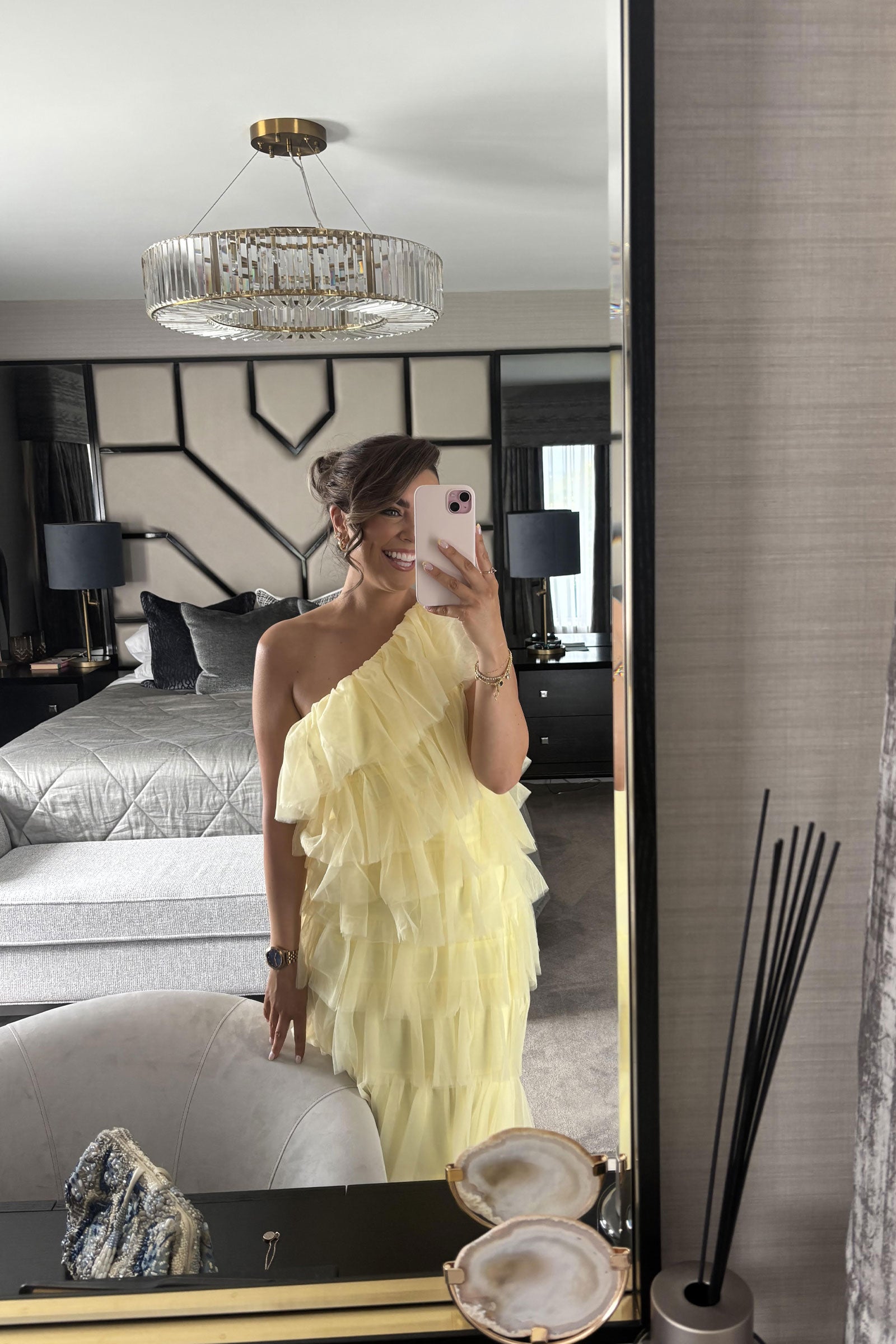 The Ravenna Dress is a dreamy full-length stunner with layers of soft tulle. Its unique one-shoulder neckline flows into a delicate adjustable strap that sweeps across the open back. Elegant, romantic, and effortlessly timeless.