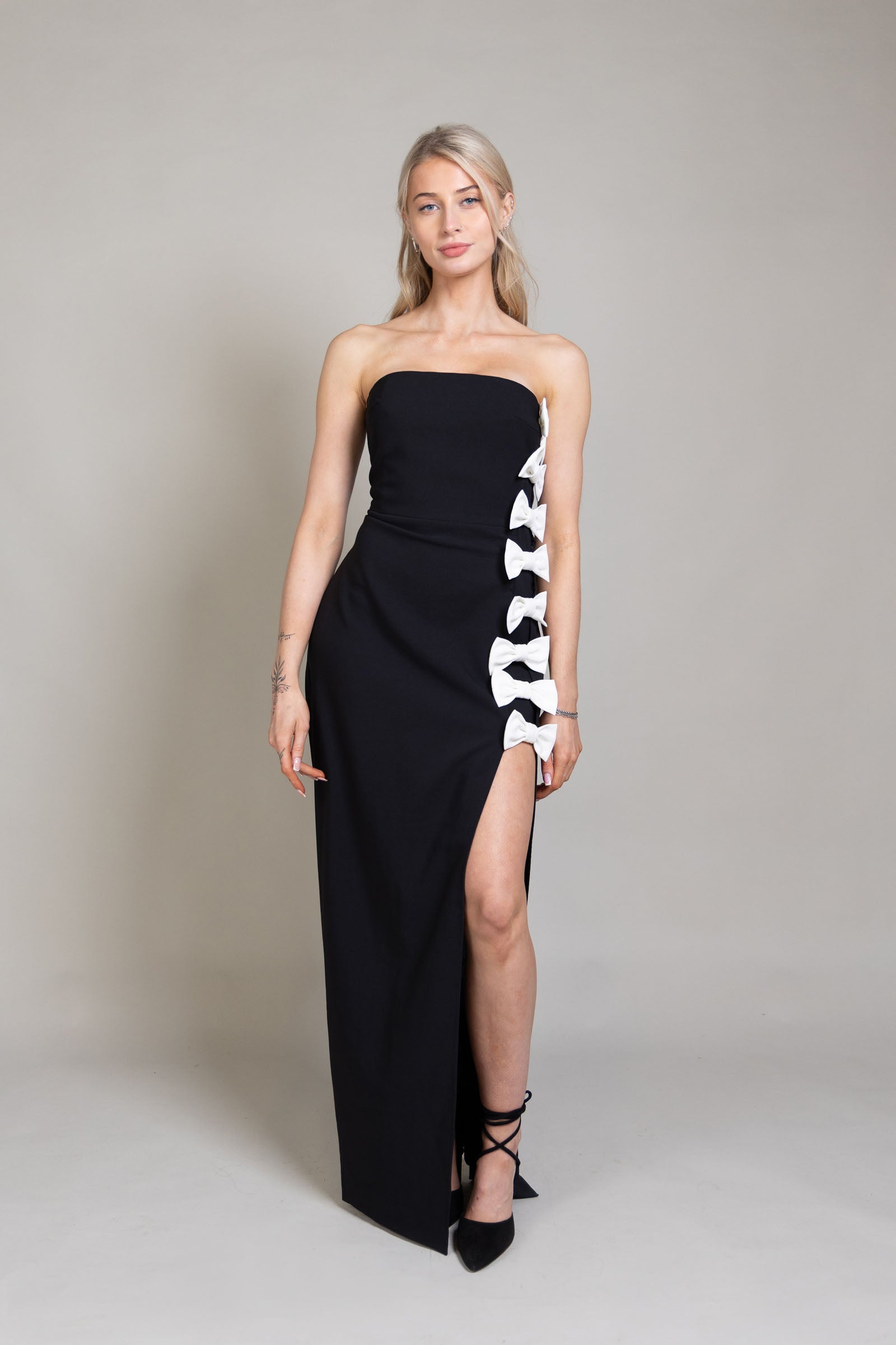 Elegant and timeless, this black strapless dress is designed to make a statement. The structured boned bodice offers a sculpted, supportive fit, while the bow accent adds a refined, feminine touch.