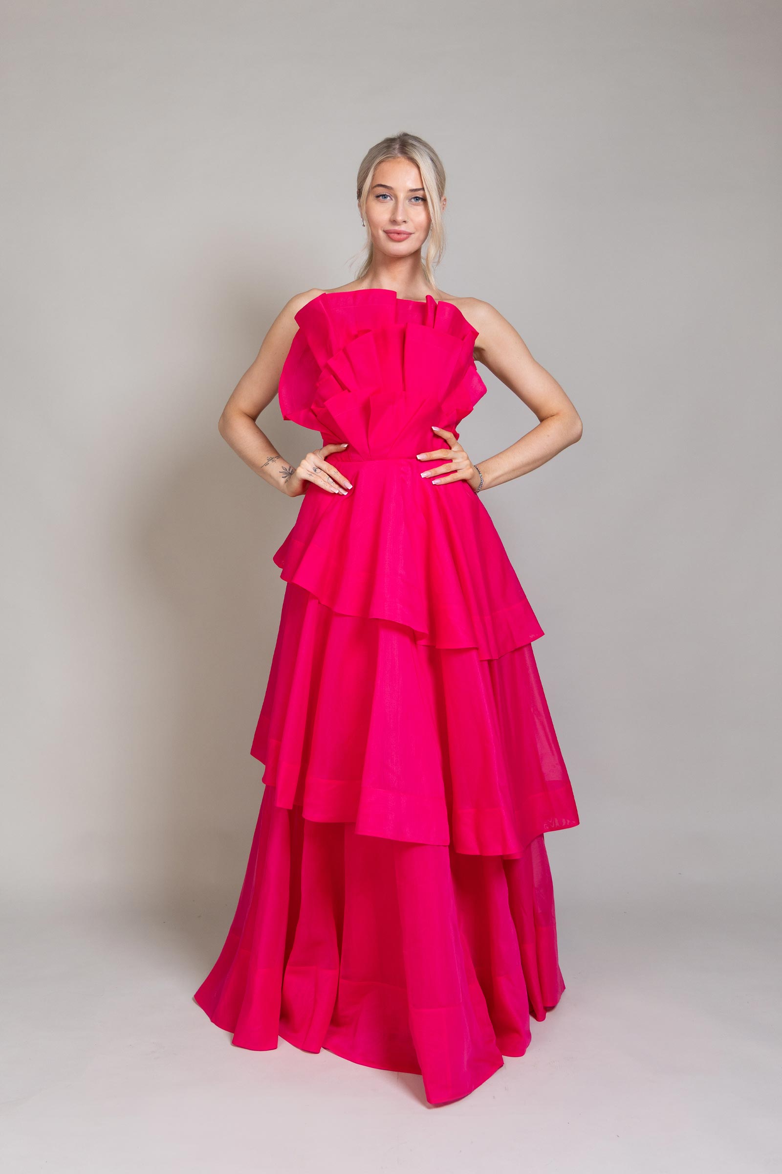 Strapless silhouette with a sculptural neckline and a voluminous, draped body. Layered ruffles create graceful movement, designed to flow effortlessly. The fitted bodice features elasticated back panels for a comfortable, contoured fit.