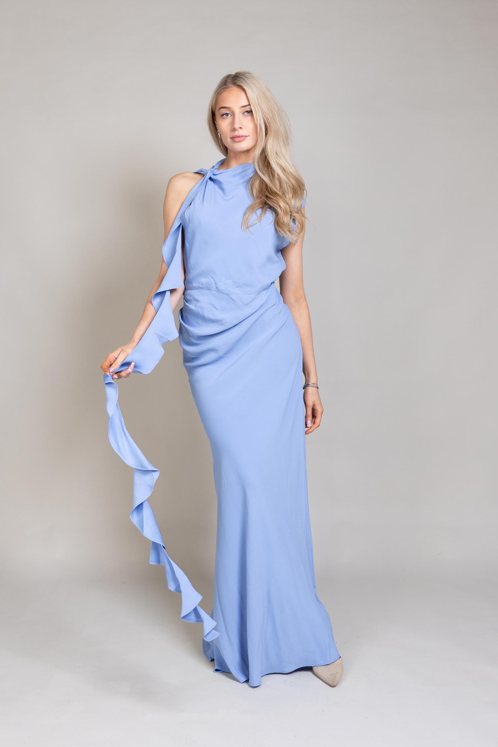 This cornflower blue maxi dress is all about soft draping and pretty details. Designed in a smooth matte satin-back crepe, it features gentle ruching and delicate ruffle accents that add movement and charm. Easy, elegant, and effortlessly flattering, this dress is perfect for celebrations, special occasions, and moments that call for a touch of romance.